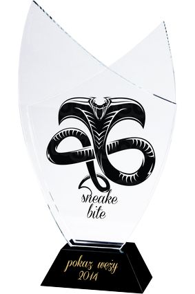 Masywna statuetka wykonana z kryształu na czarnej kryształowej podstawie.