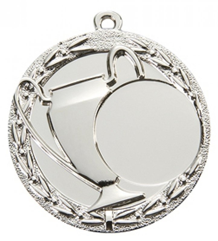 Metalowy medal z uszkiem do zawieszenia na wstążce.