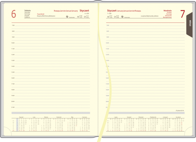 | Układ: | 1 dzień na 1 stronie, przed każdym miesiącem terminarz miesięczny |