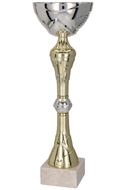 Puchary klasyczne w kolorze złotym ze srebrnymi detalami.