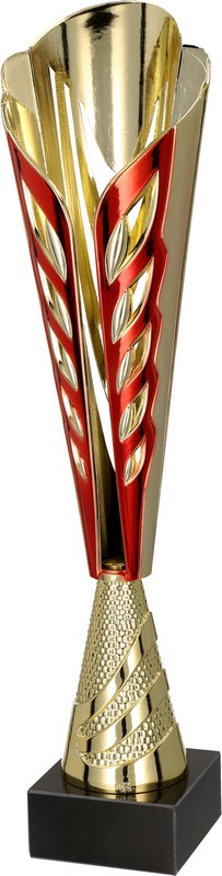Zawijany kielich wykonany z tworzywa sztucznego, z czerwonymi detalami, osadzony na starannie zaprojektowanej złączce. Cało?ć przytwierdzona do czarnej marmurowej podstawy
