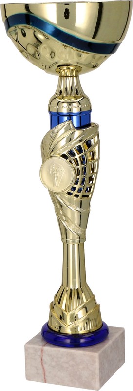 Puchary klasyczne w kolorze złotym z niebieskimi detalami.