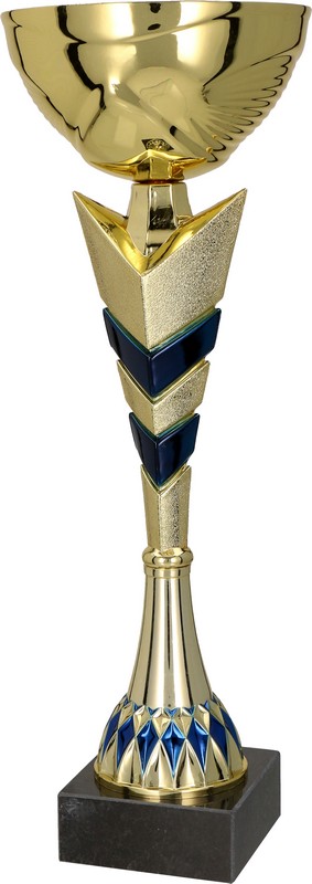 Klasycznie zdobiony metalowy kielich w kolorze złotym. Złota plastikowa złączka o charakterystycznym, agresywnym kształcie z niebieskim akcentem. Całość przytwierdzona do czarnej marmurowej podstawy.