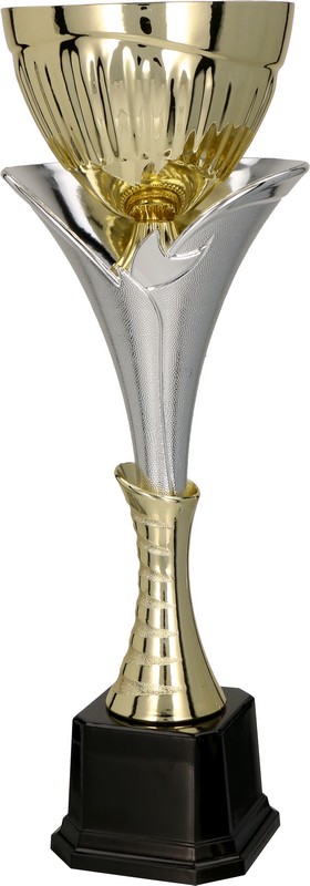 Innowacyjne puchary w kolorze złotym ze srebrną złączką.
