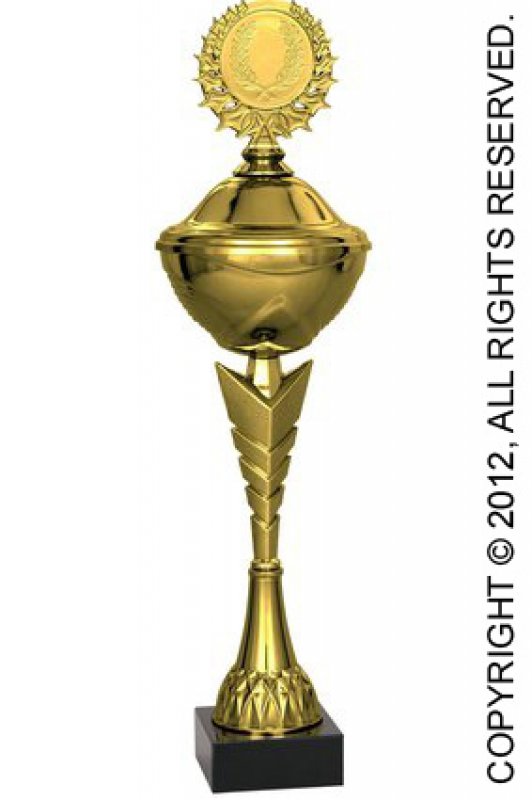 Klasycznie zdobiony metalowy kielich w kolorze złotym. Złota plastikowa złączka o charakterystycznym, agresywnym kształcie. Całość przytwierdzona do czarnej marmurowej podstawy.