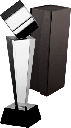 Masywna statuetka wykonana z kryształu na czarnej kryształowej podstawie. Idealnie nadaje się jako forma nagrody korporacyjnej.