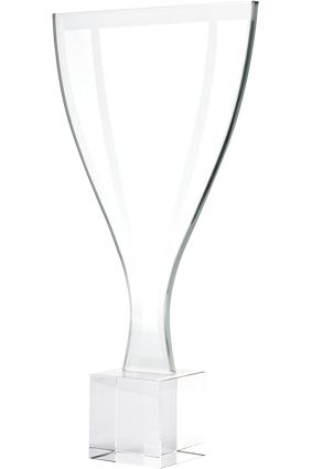 Masywna statuetka wykonana z kryształu na czarnej kryształowej podstawie. Idealnie nadaje się jako forma nagrody korporacyjnej.