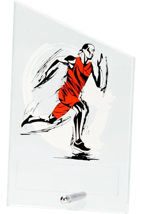 Statuetka wykonana z czystego białego szkła z nadrukiem kolorowym, przedstawiającym biegacza.