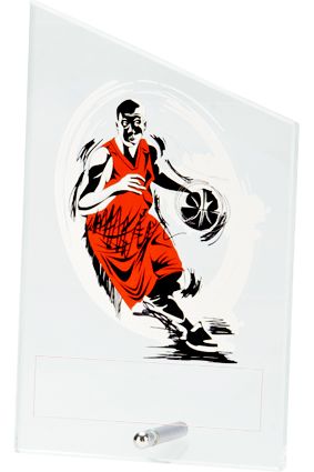 Statuetka wykonana z czystego białego szkła z nadrukiem kolorowym, przedstawiającym koszykarza.