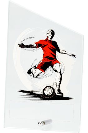 Statuetka wykonana z czystego białego szkła z nadrukiem kolorowym, przedstawiającym piłkarza.