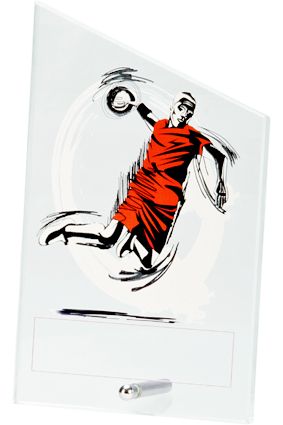 Statuetka wykonana z czystego białego szkła z nadrukiem kolorowym, przedstawiającym zawodnika piłki ręcznej.