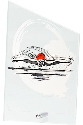 Statuetka wykonana z czystego białego szkła z nadrukiem kolorowym, przedstawiającym pływaka.