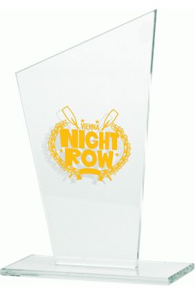 Standardowe trofeum szklane z usługą grawerowania dowolnego tekstu lub projektu. Opcjonalnie miejsce grawerowania może zostać pokryte farbą w dowolnym kolorze.