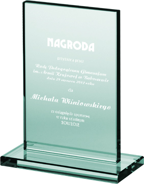 Trofeum szklane grawerowane.Świetnie prezentuje się jako nagroda korporacyjna, upominek okolicznościowy, a nawet jako trofeum sportowe