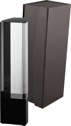 Masywna statuetka wykonana z kryształu na czarnej kryształowej podstawie. Idealnie nadaje się jako forma nagrody korporacyjnej.