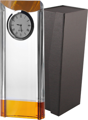 Masywna statuetka wykonana z kryształu z zegarkiem. Idealnie nadaje się jako forma nagrody korporacyjnej.