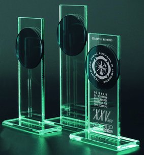 Trofeum szklane grawerowane + wypelnienie farbą - prostokątne z niebieskim kółkiem.