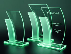Trofeum szklane grawerowane + wypełnianie farbą. Świetnie prezentuje się jako nagroda korporacyjna, upominek okolicznościowy, a nawet jako trofeum sportowe.