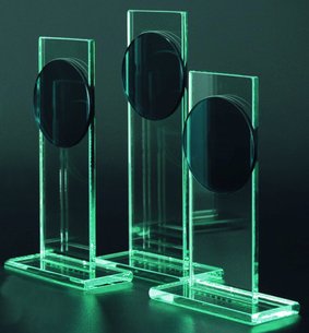 Trofeum szklane- prostokątne z niebieskim kółkiem.