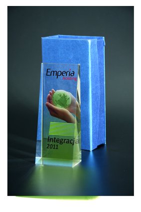 Trofeum szklane z nadrukiem kolorowym LuxorJet.Świetnie prezentuje się jako nagroda korporacyjna, upominek okolicznościowy, a nawet jako trofeum sportowe