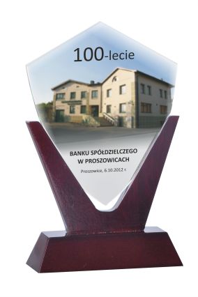 Trofeum szklane z drewnianą podstawą w kolorze ciemny mahoń. Idealnie nadaje się na wszelkiego rodzaju nagrody korporacyjne lub upominki okolicznościowe.