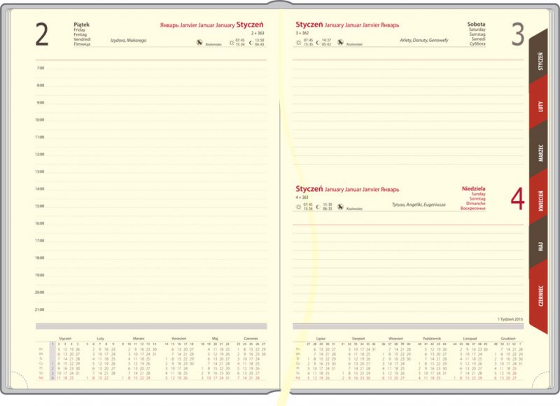 | Układ: | 1 dzień na 1 stronie, sobota i niedziela na 1 stronie, przed każdym miesiącem terminarz miesięczny |