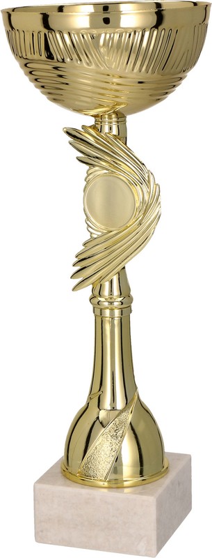 Kielich metalowy o tradycyjnym wzorze, osadzony na złotej złączce z miejscem na emblemat. Całość przytwierdzona do białej marmurowej podstawy
