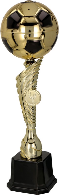 Metalowa Piłka nożna w miejscu kielicha. Złota plastikowa złączka o charakterystycznym, agresywnym kształcie. Całość przytwierdzona do czarnej plastikowej podstawy.