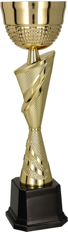 Bogato zdobiony, metalowy kielich koloru złotego. Komplet plastikowych złączek wspólnie tworzących bardzo ciekawy, nowoczesny wzór pucharu. Całość przytwierdzona do czarnej plastikowej podstawy